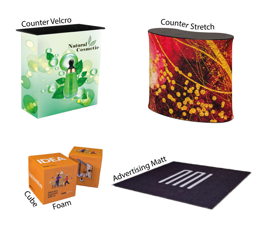 Er is geen 'Stand' zonder een echte 'Stand', maar ook een gepersonaliseerd kleed om op de grond te leggen en de gasten binnen te laten lopen, of iets om op te zitten als je met je klanten praat, dit helpt allemaal om hun bezoek memorabel te maken. Laat ons jou helpen om jouw bezoekers een volledig gepersonlaliseerde (Branded) ervaring te geven als ze je Stand binnenlopen, van bijv. een Velcro, of Stretch Counter, tot een Advertising Matt tot gepersonaliseerde Foam Cubes.